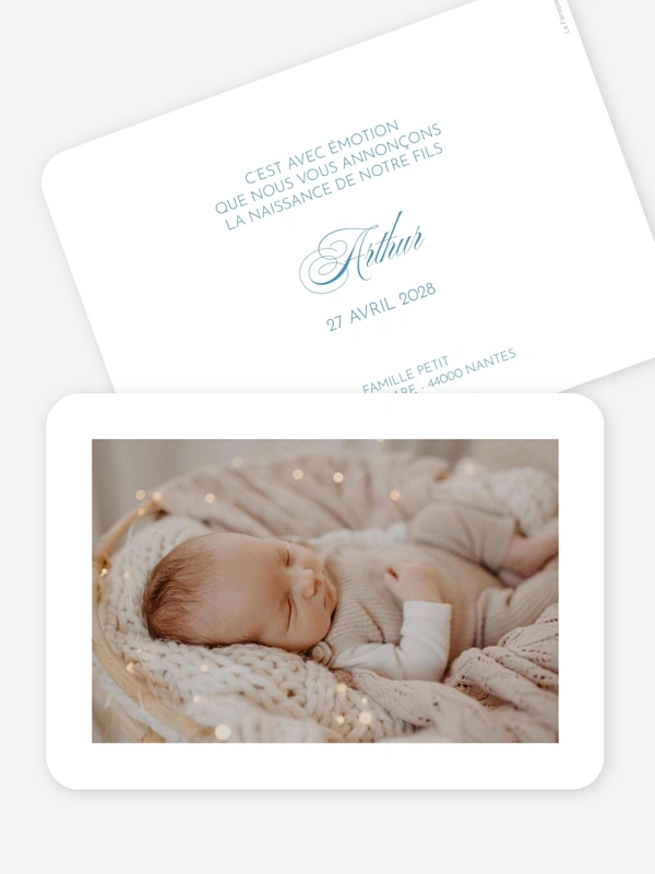 Annoncez la venue au monde de votre trésor avec le faire-part de naissance "Cœur nouveau", un modèle épuré qui laisse toute la place à l'émotion de votre plus belle photo. Ce design minimaliste souligne la douceur de cet instant unique avec une élégance naturelle et sincère. Pour vous assurer un résultat parfait, profitez de notre échantillon gratuit et de notre service de maquette personnalisé.