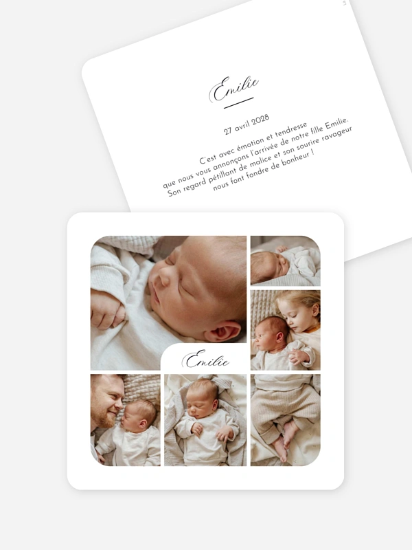 Partagez toute la tendresse de vos premiers instants à plusieurs avec le faire-part de naissance " Douce aurore ", une création pensée comme un véritable album de famille miniature. Ce modèle multi-photos vous permet de mettre en lumière chaque petit détail de votre nouveau-né et de créer une carte de naissance qui restera un souvenir précieux pour vos proches. Pour vous accompagner dans ce moment unique, nous vous offrons la possibilité de commander vos échantillons personnalisés afin de valider votre création en toute sérénité. Profitez de notre service de mise en page pour sublimer vos clichés et bénéficier d'une impression de haute qualité. Créez votre lot en ligne dès maintenant pour annoncer cette merveilleuse nouvelle.