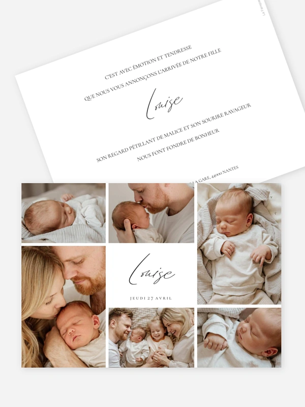 Partagez vos plus beaux instants de bonheur avec le faire-part de naissance "Douce étreinte", une création délicate qui sublime vos photos de famille dans un style épuré et moderne. Pour une annonce tout en douceur, profitez de notre échantillon offert pour créer votre carte de naissance personnalisée et bénéficiez de notre service de retouche inclus pour un résultat de haute qualité.