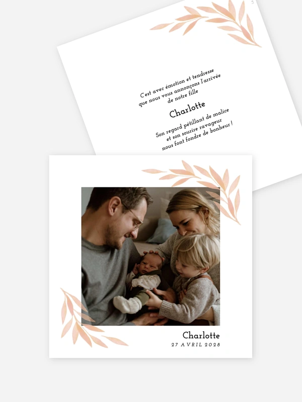 Partagez les premiers chapitres de votre vie de famille avec le faire-part de naissance "Douce Histoire", une création délicate qui entoure votre plus belle photo de branches d'aquarelle. Ce design poétique et chaleureux est idéal pour annoncer l'arrivée de votre enfant avec élégance et une touche de naturel. Pour vous accompagner dans ce moment unique, nous vous offrons une carte d'échantillon gratuite afin de découvrir la qualité exceptionnelle de nos papiers. Profitez de notre service de création simple et d'une livraison rapide pour envoyer cette magnifique nouvelle à tous vos proches. Créez votre lot en ligne dès maintenant.