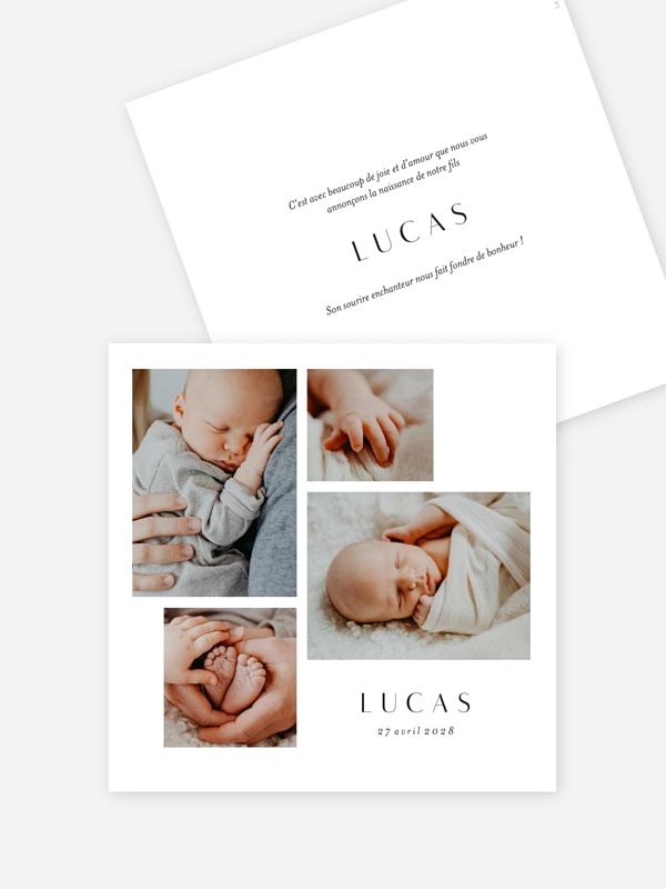 Annoncez l'arrivée de votre petit trésor avec toute la tendresse de la faire-part de naissance "Fil de douceur". Ce design sobre met magnifiquement en valeur les premières photos de votre bébé, pour que vous puissiez partager ce moment émouvant avec vos proches.