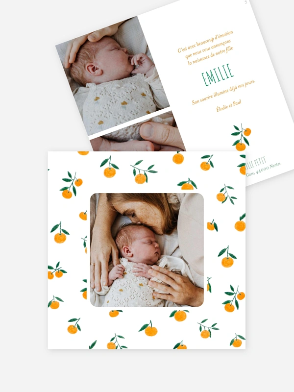 Annoncez la venue au monde de votre petit trésor avec toute la douceur du faire-part de naissance "Fleur d’oranger". Ce modèle aux illustrations fruitées et pleines de vie apporte une touche de fraîcheur et de poésie pour partager votre nouveau bonheur avec vos proches.