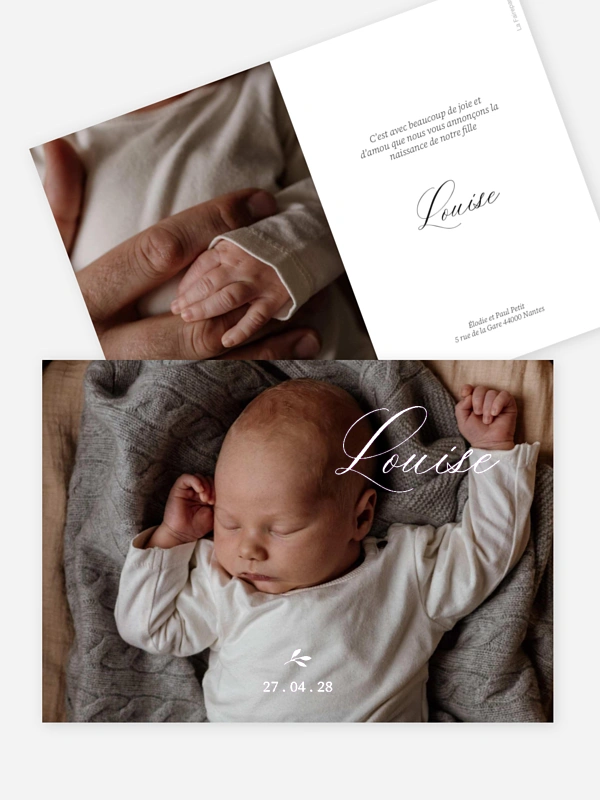 Annoncez l'arrivée de votre petit trésor avec toute la tendresse de la faire-part de naissance "Petit bourgeon". Ce design sobre met magnifiquement en valeur les premières photos de votre bébé, pour que vous puissiez partager ce moment émouvant avec vos proches.