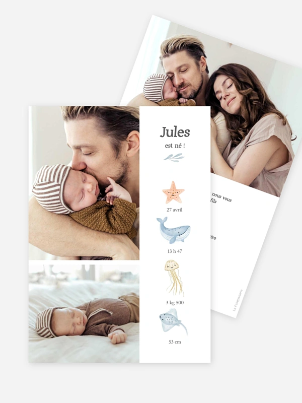Annoncez l'arrivée de votre petit trésor avec douceur grâce au faire-part de naissance "Vagues de tendresse". Ce modèle illustré d'adorables créatures marines met joliment en avant les premières informations de votre nouveau-né pour un souvenir mémorable à partager avec vos proches. Pour vous accompagner dans ce moment unique, nous vous offrons la possibilité de commander une carte dechantillon gratuite afin de confirmer votre choix. Profitez également de notre service de création simple et intuitif pour personnaliser votre annonce en quelques instants. Créez votre lot en ligne dès maintenant.