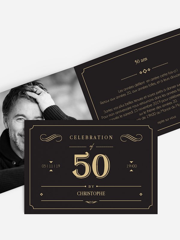 Avec la carte anniversaire "Gatsby" mettez les années folles à l'honneur et invitez tous vos proches à venir fêter vos 50 ans.