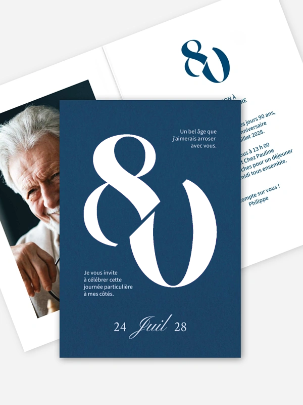 Un chiffre rond, une belle occasion, et surtout : l’envie de partager ce moment avec celles et ceux qui comptent. Notre invitation anniversaire "Bel âge" met en valeur les 80 ans avec élégance et une pointe d’émotion. Elle offre une manière personnelle d’inviter vos proches à célébrer ce cap marquant à vos côtés. L’impression de qualité et le service de création facile font de cette carte un vrai plaisir à envoyer. Créez votre lot en ligne dès maintenant.