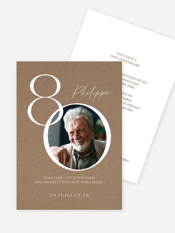 Un sourire malicieux, un regard pétillant, et déjà 80 bougies à souffler. L’invitation d’anniversaire "Jour de bonheur" capture toute la tendresse d’un moment à célébrer en famille ou entre ami·es. Avec sa photo mise en valeur et son message clair, cette carte crée un lien chaleureux dès l’ouverture. Imprimée avec soin sur des papiers de qualité, elle arrive rapidement et prête à toucher les cœurs. Créez votre lot en ligne dès maintenant.