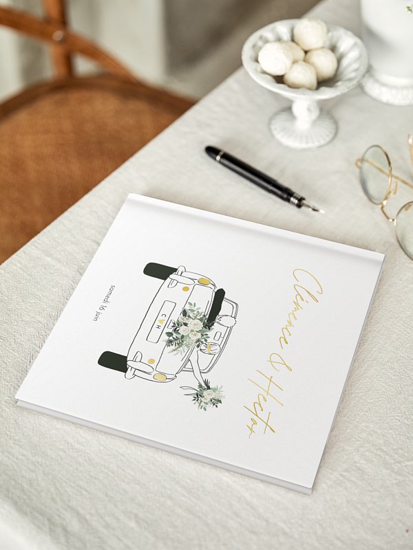 Gardez un précieux souvenir de votre mariage avec le livre d'or mariage "Escapade Greenery". Vos invités pourront y laisser petits mots, dessins et photos. Les pages intérieures sont lisses et blanches. Vos invités pourront écrire leurs mots au stylo, feutre ou marqueur sans problème de transparence. NB : La couleur mentionnée dans la description ou dans la sélection de papier n’est pas représentative du rendu imprimé. Le produit aura un rendu conforme au visuel dans l’outil de personnalisation. La dentelle représentée n'est qu'un effet imprimé. Le livre d’or sera reçu dans un colis séparé du reste de votre commande.