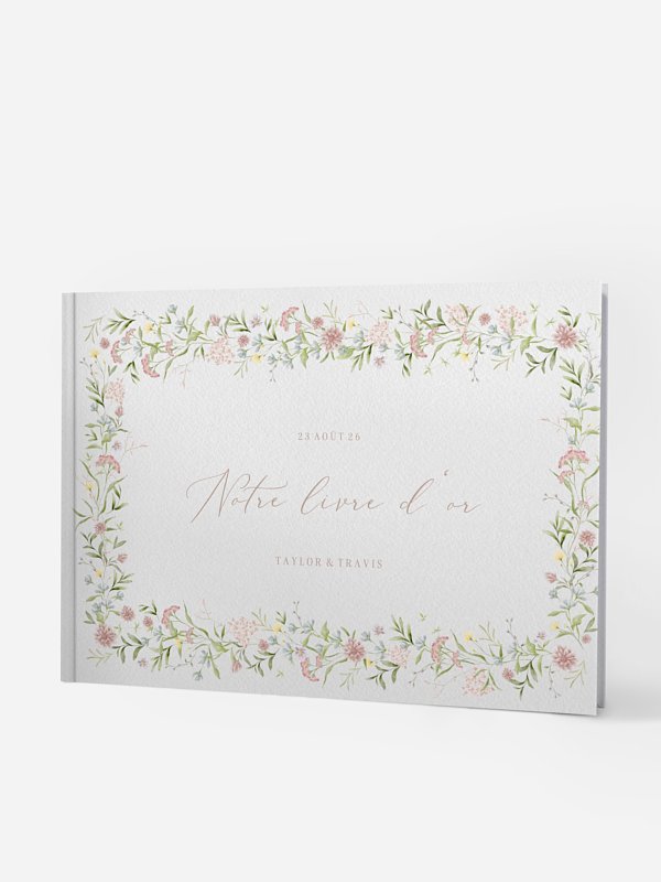 - Pages intérieures : 1 double-page pour les marié.e.s, 2 doubles-pages différentes pour les invités.