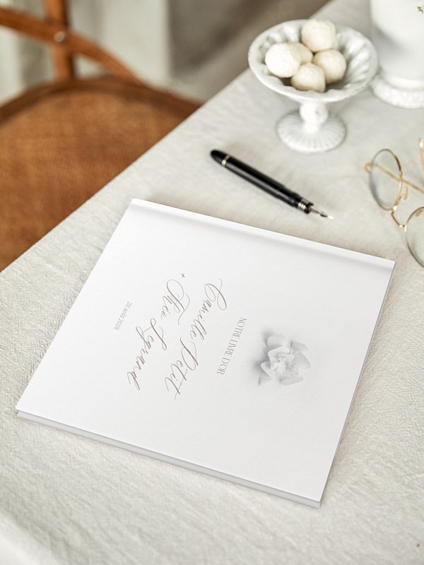 - Pages intérieures : 1 double-page pour les marié.e.s, 2 doubles-pages différentes pour les invités.