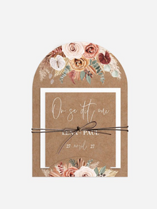 Les faire-part de mariage de style Moho impressionnent par leur combinaison unique d'illustrations florales flamboyantes, de tons de terre doux et de calligraphie courbée.