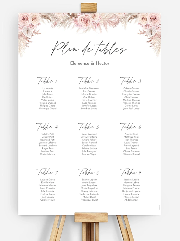 Avec le joli poster plan de table mariage "Escapade Boho", indiquez à vos convives à quelle table ils sont placés en un seul coup d'oeil.