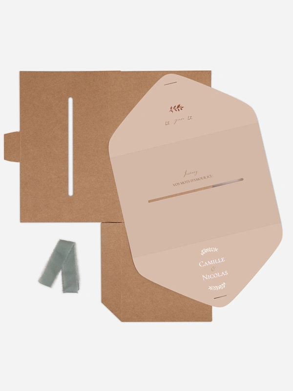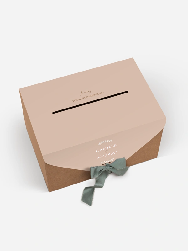 L’urne de mariage "Bohemian Bouquet" reflète une élégance simple et naturelle, parfaite pour recueillir les mots tendres et les attentions de vos proches. Son style bohème s’accorde facilement à une décoration chaleureuse et authentique, apportant une belle harmonie à votre réception. Facile à personnaliser avec vos prénoms, elle devient un souvenir précieux de votre grand jour. Livrée rapidement, elle vous accompagne avec douceur dans vos préparatifs.