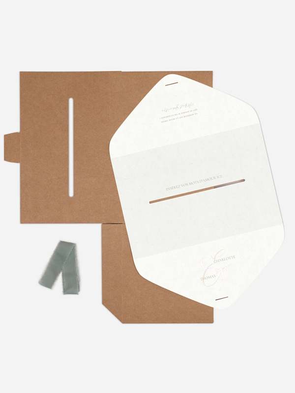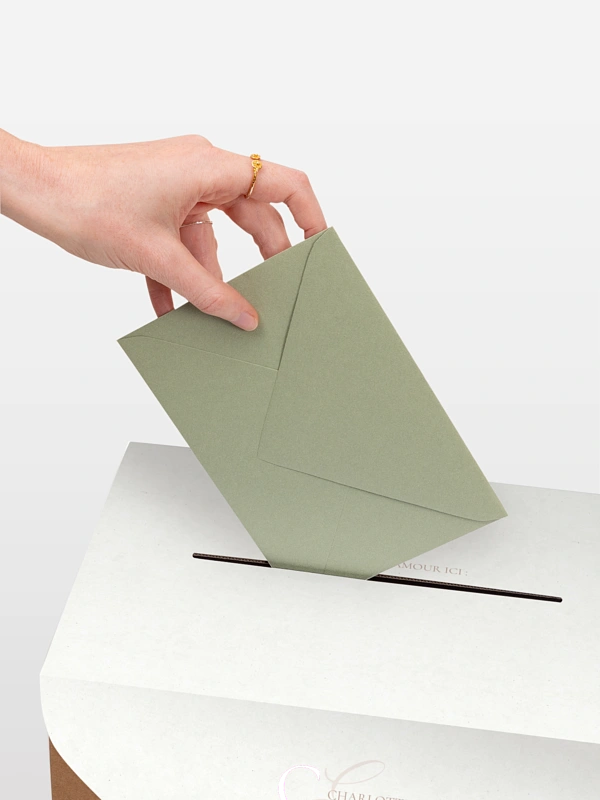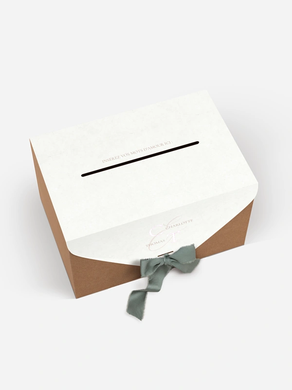 L’urne de mariage "Elegant Love" s’intègre avec douceur à votre décoration tout en créant un joli moment de complicité avec vos invité·e·s. Avec son design chaleureux et son ruban délicat, elle devient un lieu symbolique où se glissent vœux, pensées et petites attentions. Un détail simple, mais plein de cœur, pour accompagner votre grand jour. Fabriquée avec soin et livrée rapidement, elle se personnalise en toute simplicité.