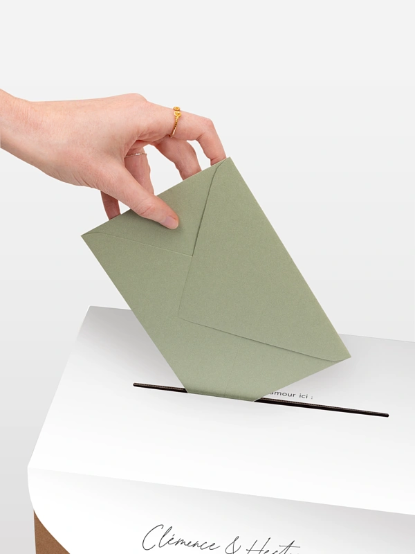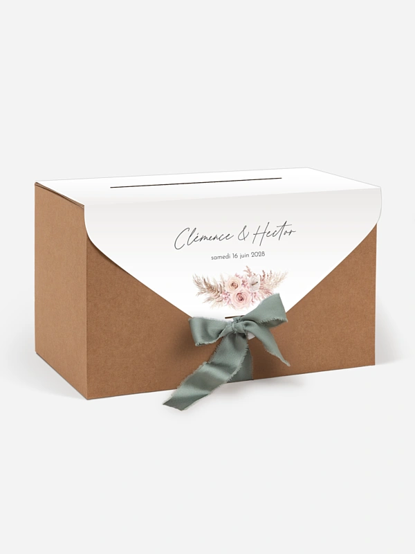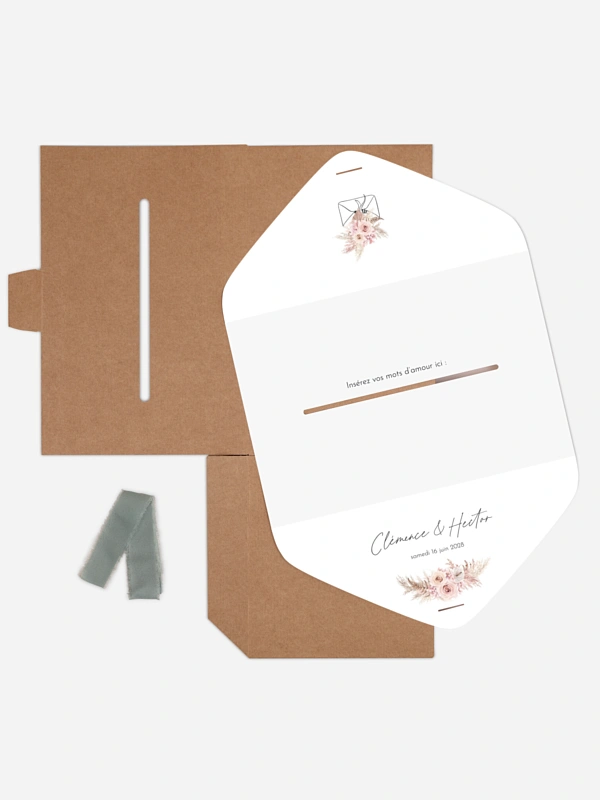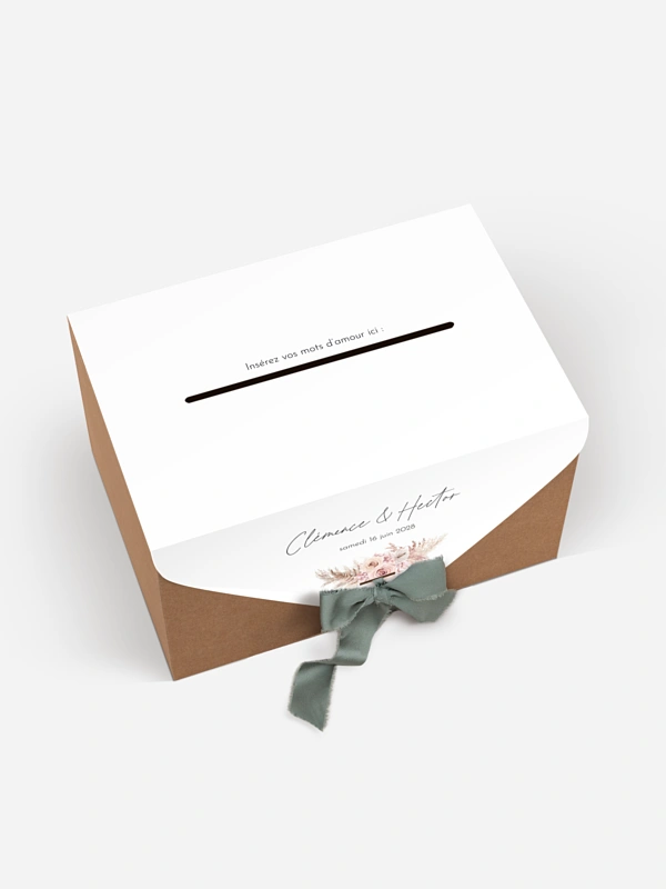 Notre urne mariage "Escapade Boho" est une solution à la fois élégante et pratique, elle est idéale pour recueillir en toute sécurité les cartes de vœux, enveloppes et petites attentions de vos invités. Facile à monter, l’urne est livrée avec une couverture en papier personnalisée et un ruban assorti de votre choix. Une fois assemblée, elle s’intègre parfaitement à l’univers de votre papeterie de mariage, en harmonie avec votre faire-part. Plus qu’un simple accessoire, c’est une véritable pièce déco qui sublimera votre réception tout en gardant un rôle essentiel.