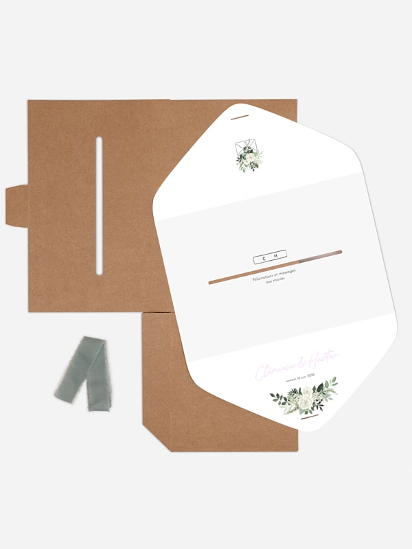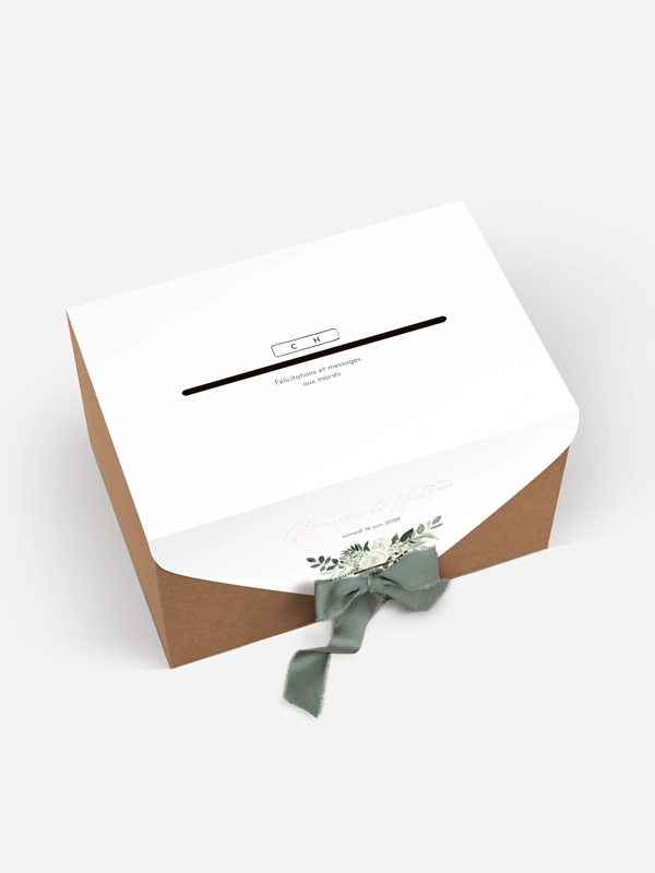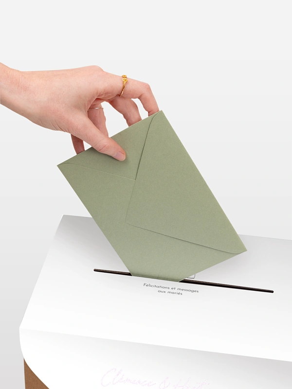 Notre urne mariage "Escapade Greenery" est une solution à la fois élégante et pratique, elle est idéale pour recueillir en toute sécurité les cartes de vœux, enveloppes et petites attentions de vos invités. Facile à monter, l’urne est livrée avec une couverture en papier personnalisée et un ruban assorti de votre choix. Une fois assemblée, elle s’intègre parfaitement à l’univers de votre papeterie de mariage, en harmonie avec votre faire-part. Plus qu’un simple accessoire, c’est une véritable pièce déco qui sublimera votre réception tout en gardant un rôle essentiel.