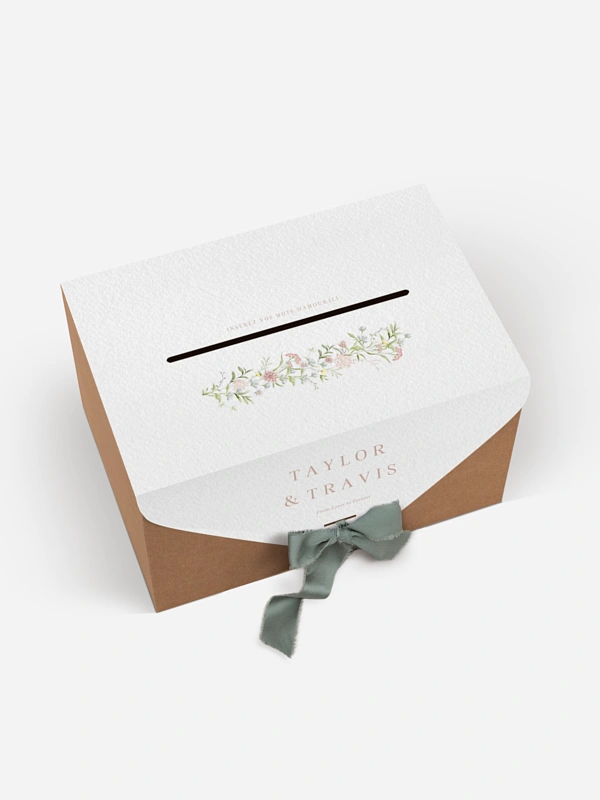 Notre urne mariage "Lover to Forever" est une solution à la fois élégante et pratique, elle est idéale pour recueillir en toute sécurité les cartes de vœux, enveloppes et petites attentions de vos invités. Facile à monter, l’urne est livrée avec une couverture en papier personnalisée et un ruban assorti de votre choix. Une fois assemblée, elle s’intègre parfaitement à l’univers de votre papeterie de mariage, en harmonie avec votre faire-part. Plus qu’un simple accessoire, c’est une véritable pièce déco qui sublimera votre réception tout en gardant un rôle essentiel.