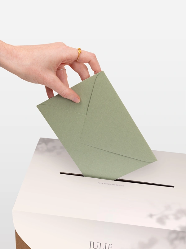 Notre urne mariage "Komorebi Joy" est une solution à la fois élégante et pratique, elle est idéale pour recueillir en toute sécurité les cartes de vœux, enveloppes et petites attentions de vos invités. Facile à monter, l’urne est livrée avec une couverture en papier personnalisée et un ruban assorti de votre choix. Une fois assemblée, elle s’intègre parfaitement à l’univers de votre papeterie de mariage, en harmonie avec votre faire-part. Plus qu’un simple accessoire, c’est une véritable pièce déco qui sublimera votre réception tout en gardant un rôle essentiel.