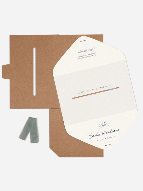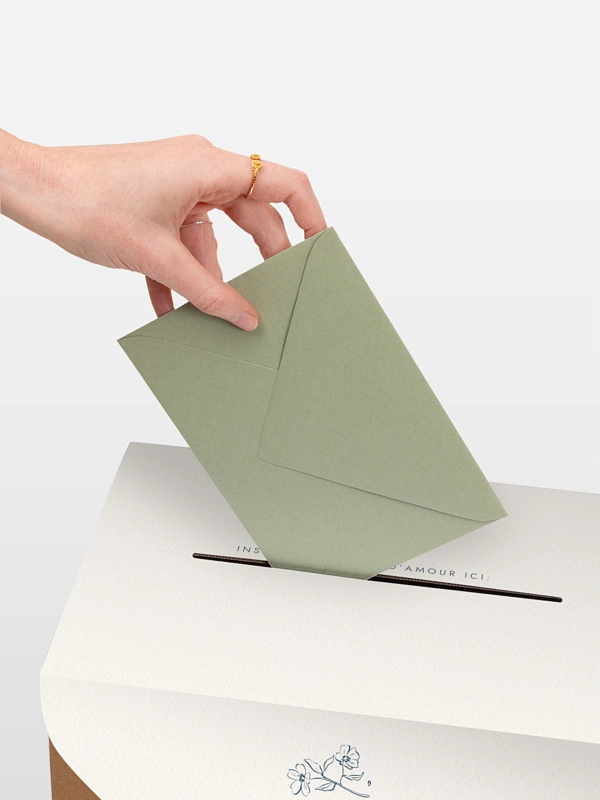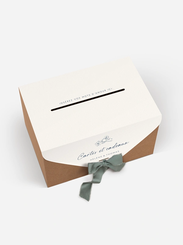 Notre urne mariage „Méditerranéen“ est une solution à la fois élégante et pratique, elle est idéale pour recueillir en toute sécurité les cartes de vœux, enveloppes et petites attentions de vos invités. Facile à monter, l’urne est livrée avec une couverture en papier personnalisée et un ruban assorti de votre choix. Une fois assemblée, elle s’intègre parfaitement à l’univers de votre papeterie de mariage, en harmonie avec votre faire-part. Plus qu’un simple accessoire, c’est une véritable pièce déco qui sublimera votre réception tout en gardant un rôle essentiel.