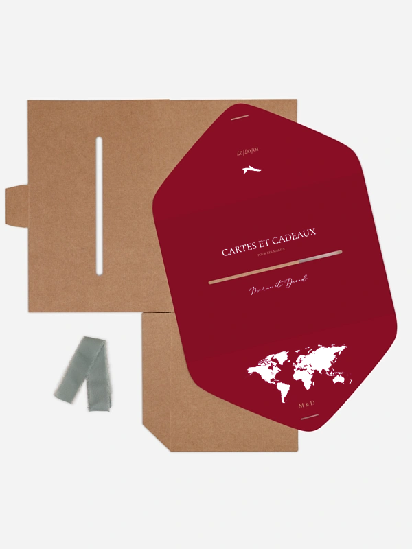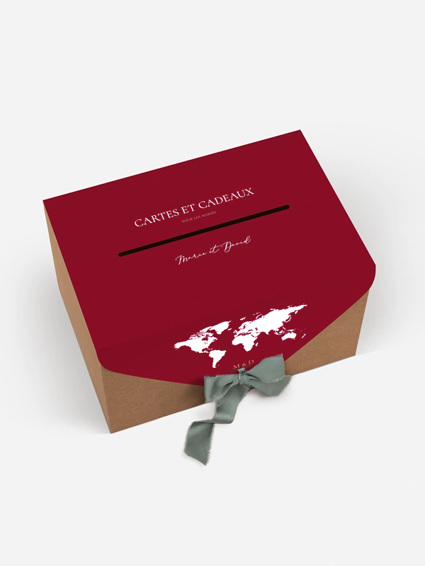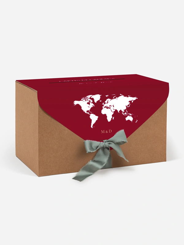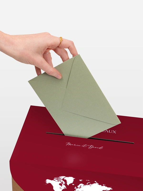 Avec son motif carte du monde et sa touche élégante, l’urne de mariage "Passeport chic" invite au voyage – celui que vous débutez ensemble. Elle recueille les vœux, attentions et contributions de vos proches avec style, tout en ajoutant une belle note personnalisée à votre déco. Idéale pour les amoureux d’évasion ou les mariages à thème, elle se personnalise facilement et arrive rapidement chez vous.