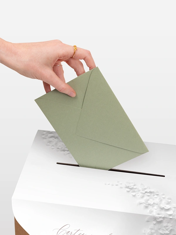 Notre urne mariage "Poème sur papier" est une solution à la fois élégante et pratique, elle est idéale pour recueillir en toute sécurité les cartes de vœux, enveloppes et petites attentions de vos invités. Facile à monter, l’urne est livrée avec une couverture en papier personnalisée et un ruban assorti de votre choix. Une fois assemblée, elle s’intègre parfaitement à l’univers de votre papeterie de mariage, en harmonie avec votre faire-part. Plus qu’un simple accessoire, c’est une véritable pièce déco qui sublimera votre réception tout en gardant un rôle essentiel.